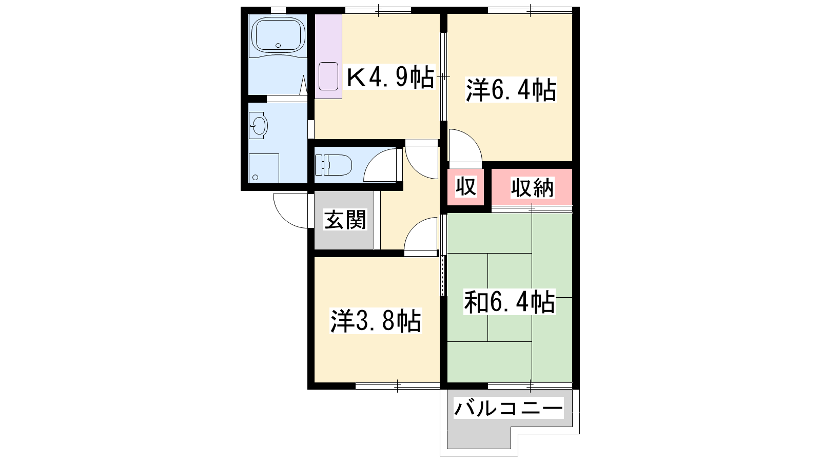 - K4.9帖、洋室6.4帖、和室6.4帖、洋室3.8帖
