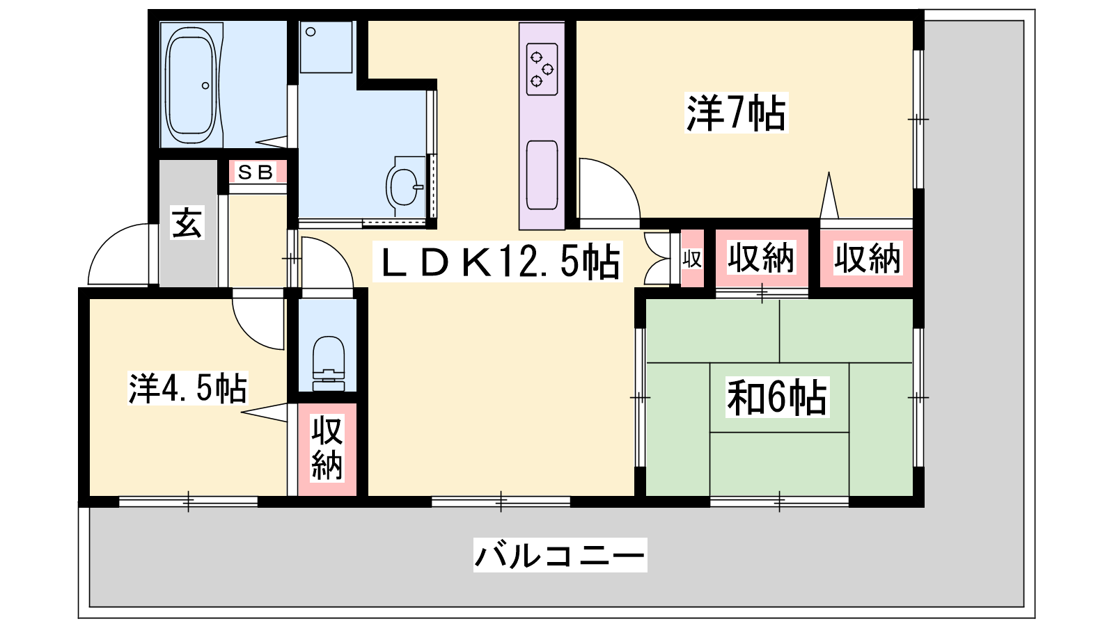 - LDK12.5帖、洋室7帖、洋室4.5帖、和室6帖