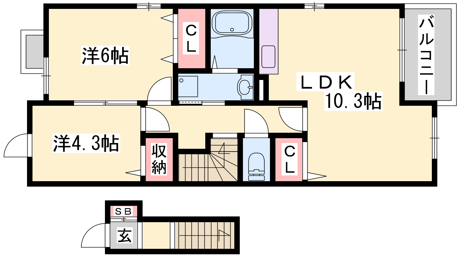 - LDK10.3帖、洋室6帖、洋室4.3帖