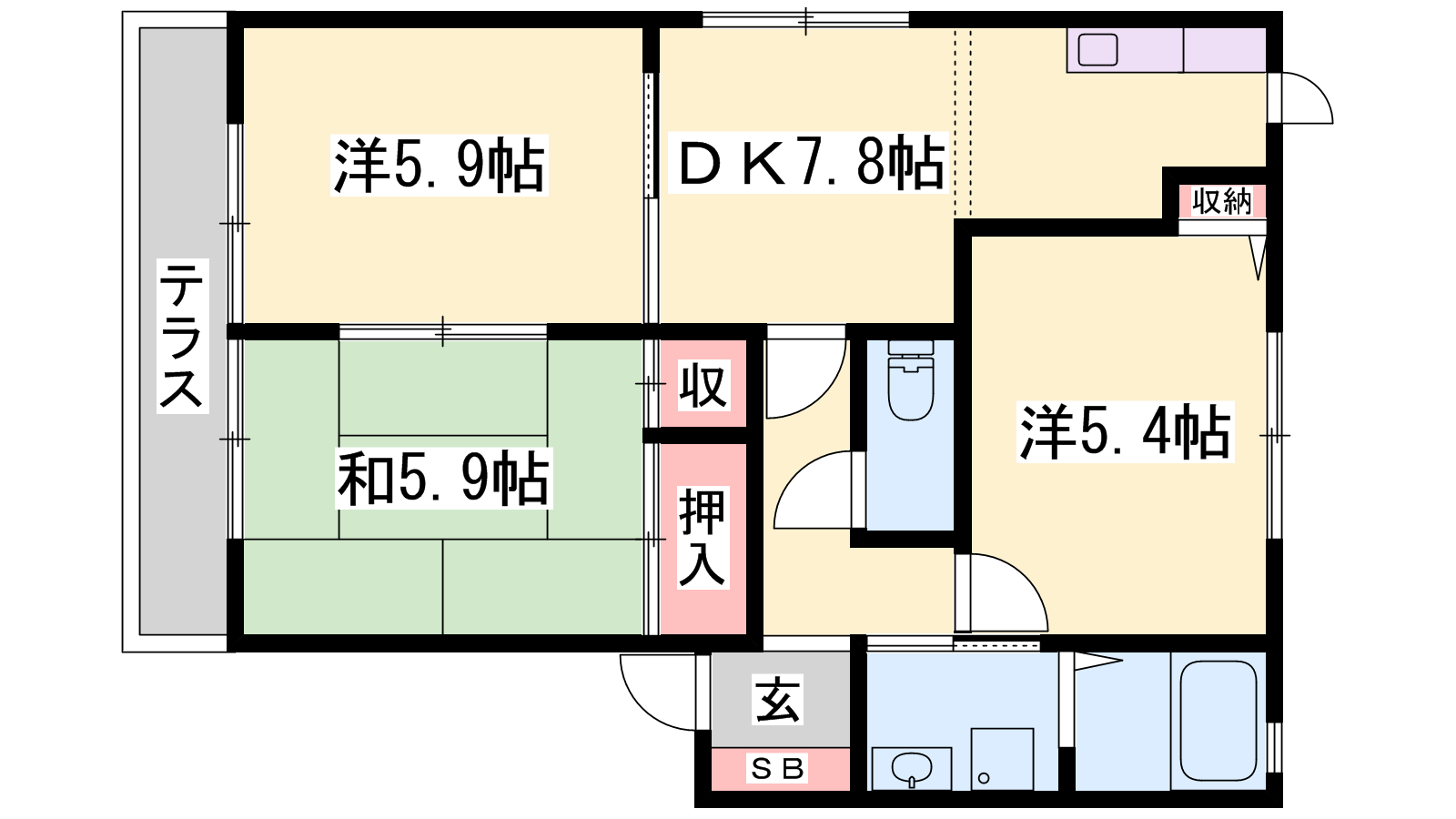 - DK7.8帖、洋室5.4帖、洋室5.9帖、和室5.9帖