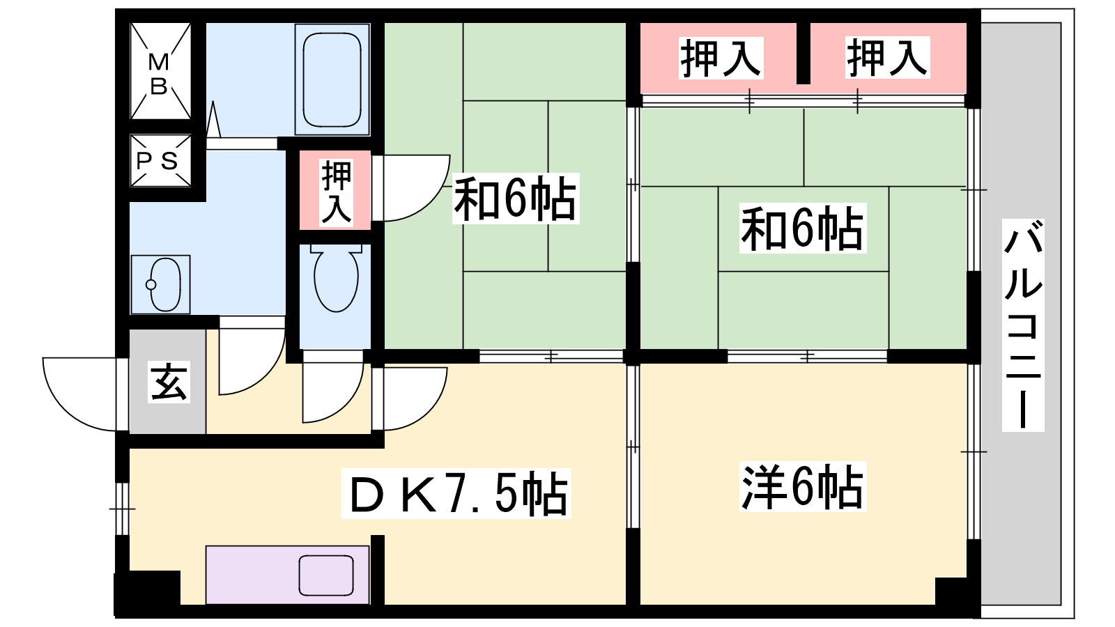 - DK7.5帖、洋室6帖、和室6帖、和室6帖