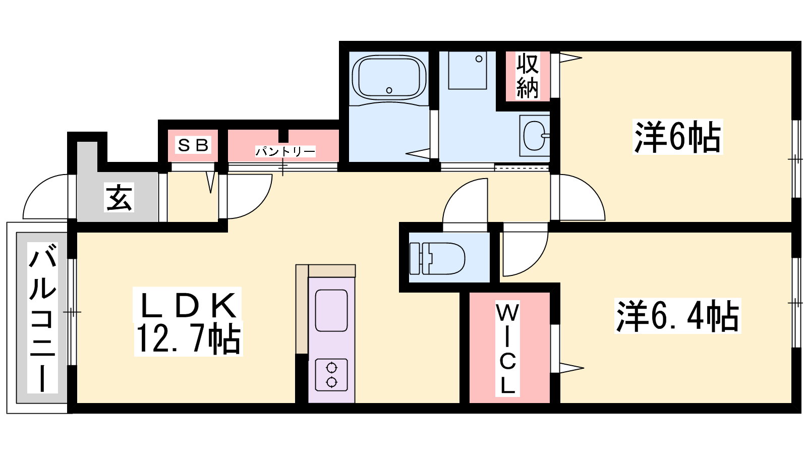 - LDK12.7帖、洋室6.4帖、洋室6帖