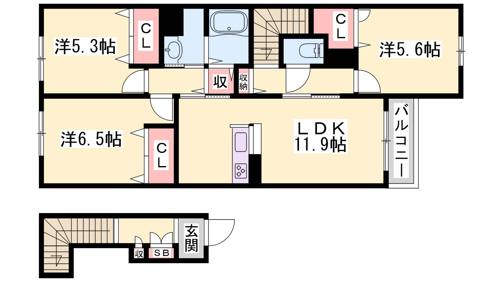 - LDK11.9帖、洋室6.5帖、洋室5.6帖、洋室5.3帖