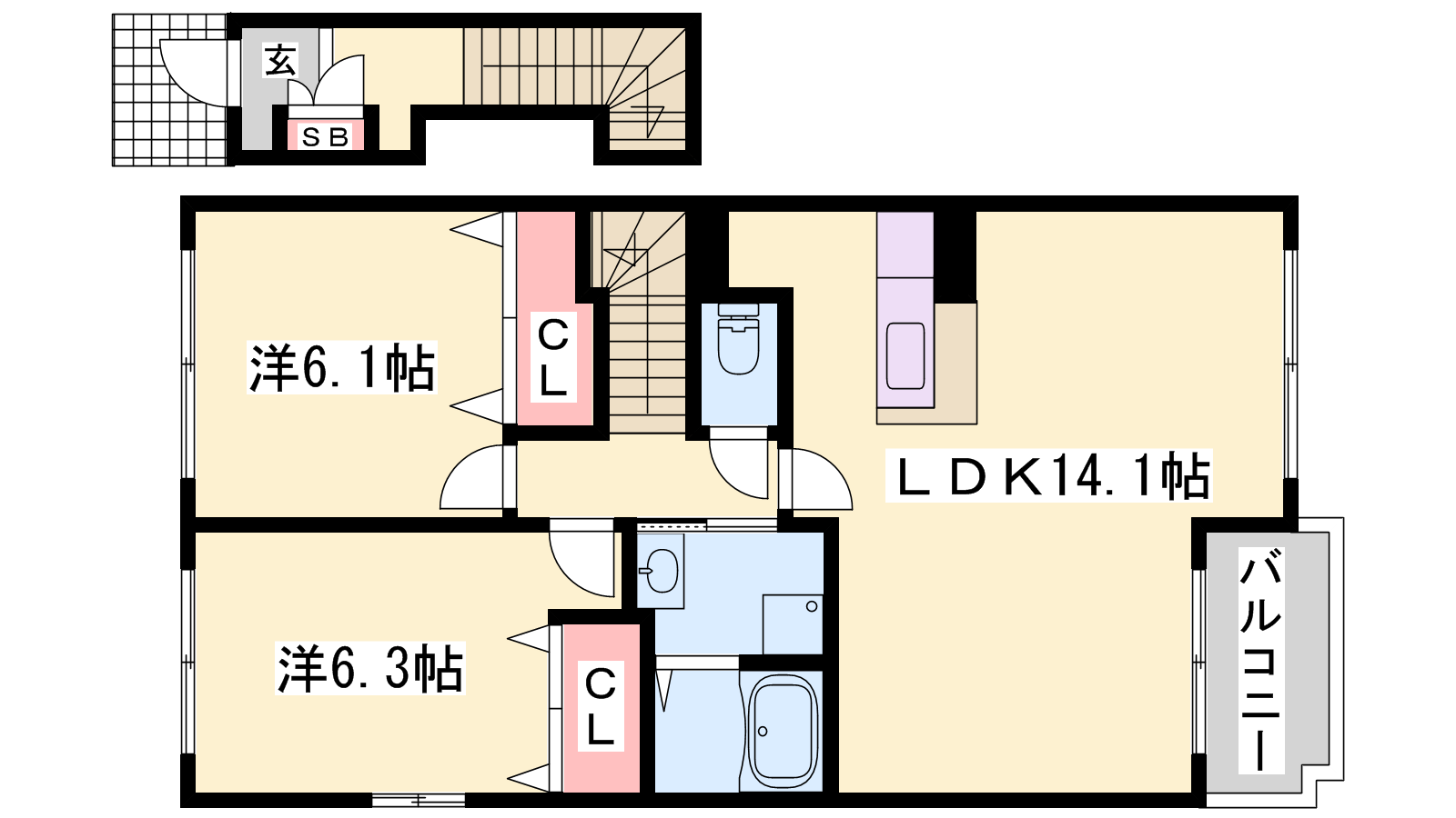 - LDK14.1帖、洋室6.3帖、洋室6.1帖