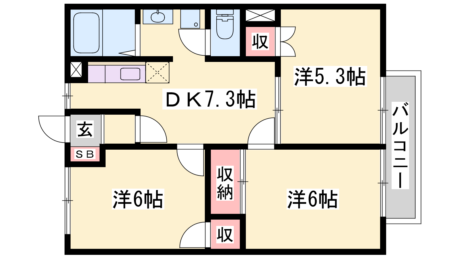 - DK7.3帖、洋室6帖、洋室6帖、洋室5.3帖