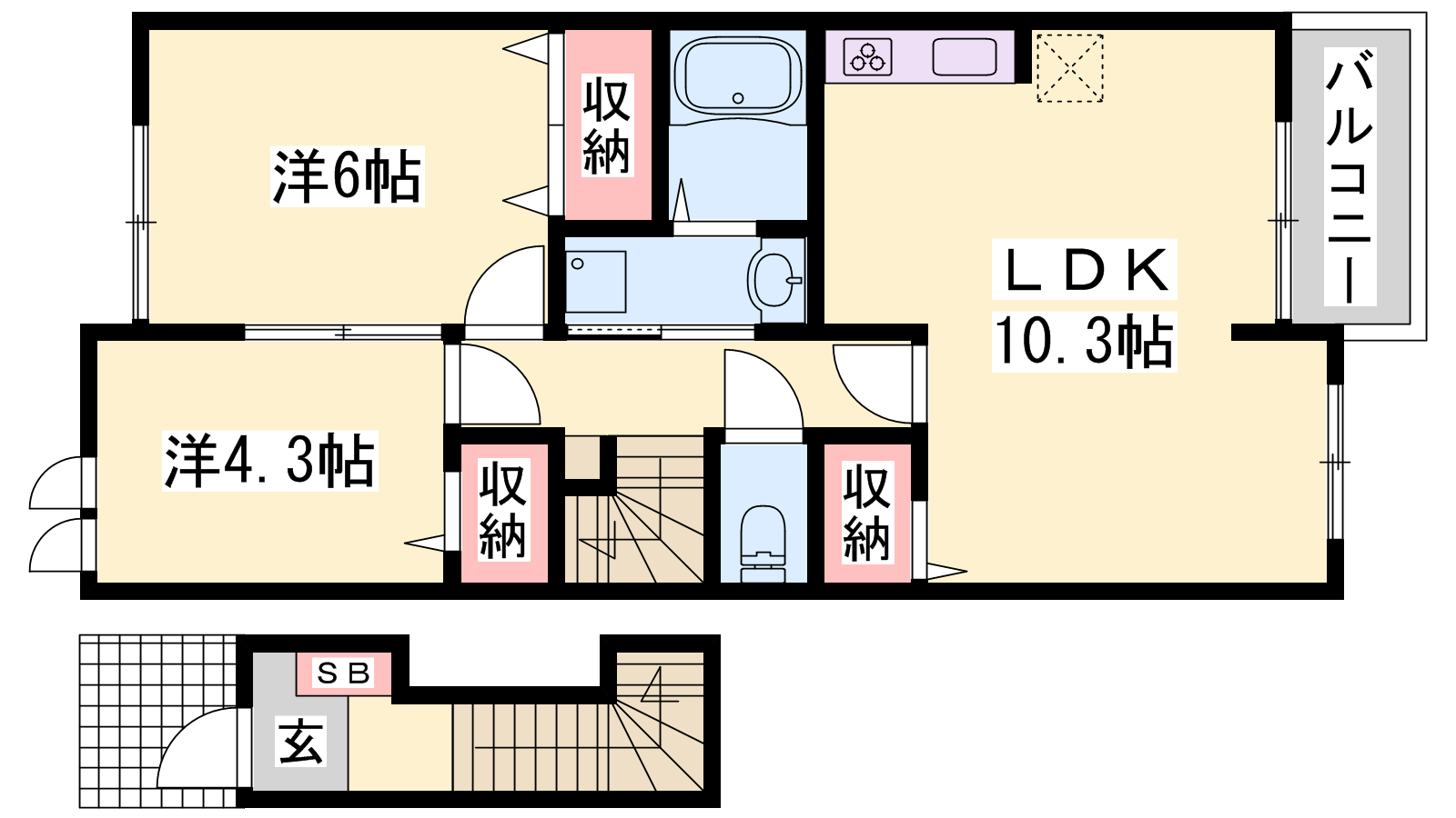 - LDK10.3帖、洋室6帖、洋室4.3帖