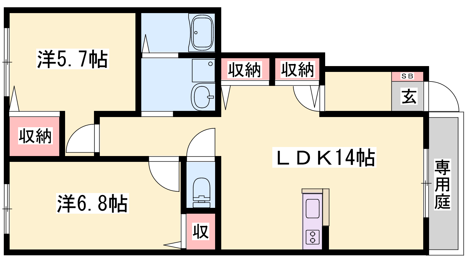 - LDK14帖、洋室6.8帖、洋室5.7帖