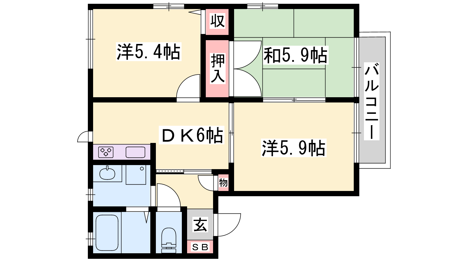 - DK6帖、洋室5.9帖、洋室5.4帖、和室5.9帖