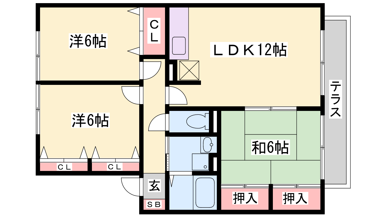 - LDK12帖、洋室6帖、洋室6帖、和室6帖
