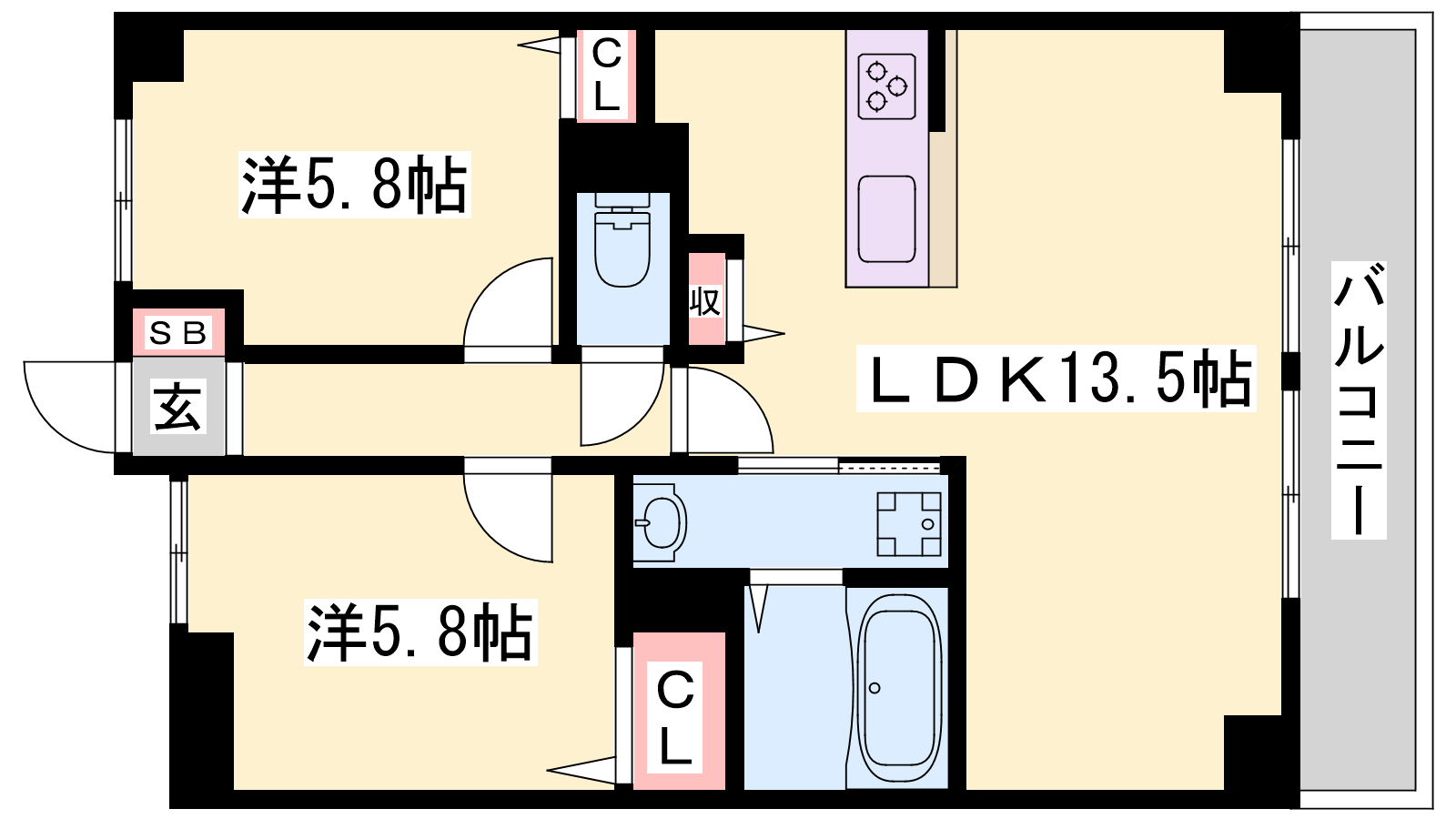 - LDK13.5帖、洋室5.8帖、洋室5.8帖