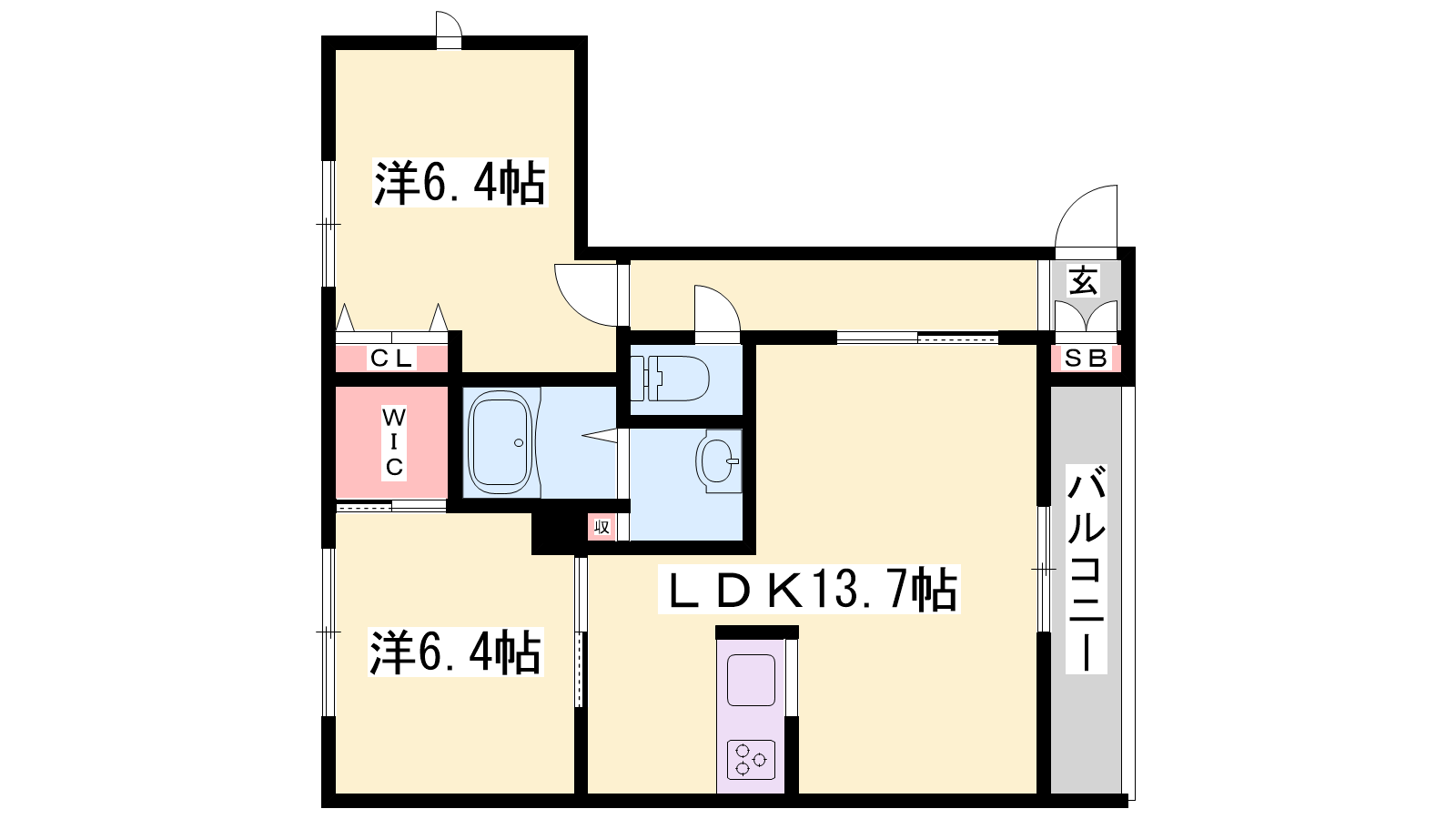 - LDK13.7帖、洋室6.4帖、洋室6.4帖