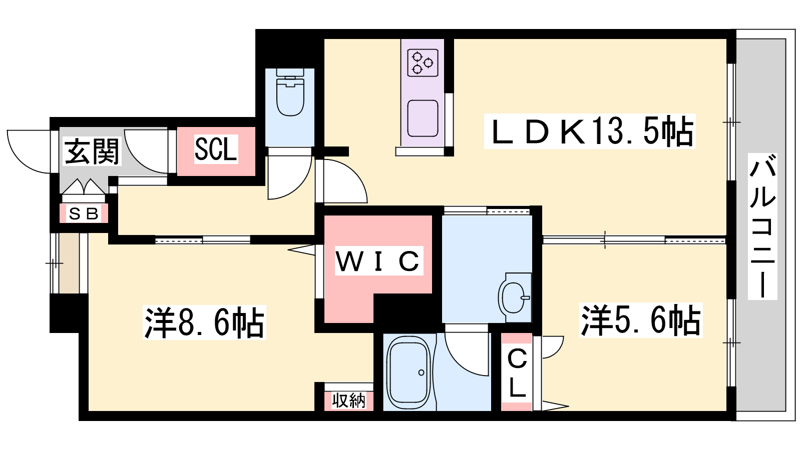 - LDK13.5帖、洋室8.6帖、洋室5.6帖