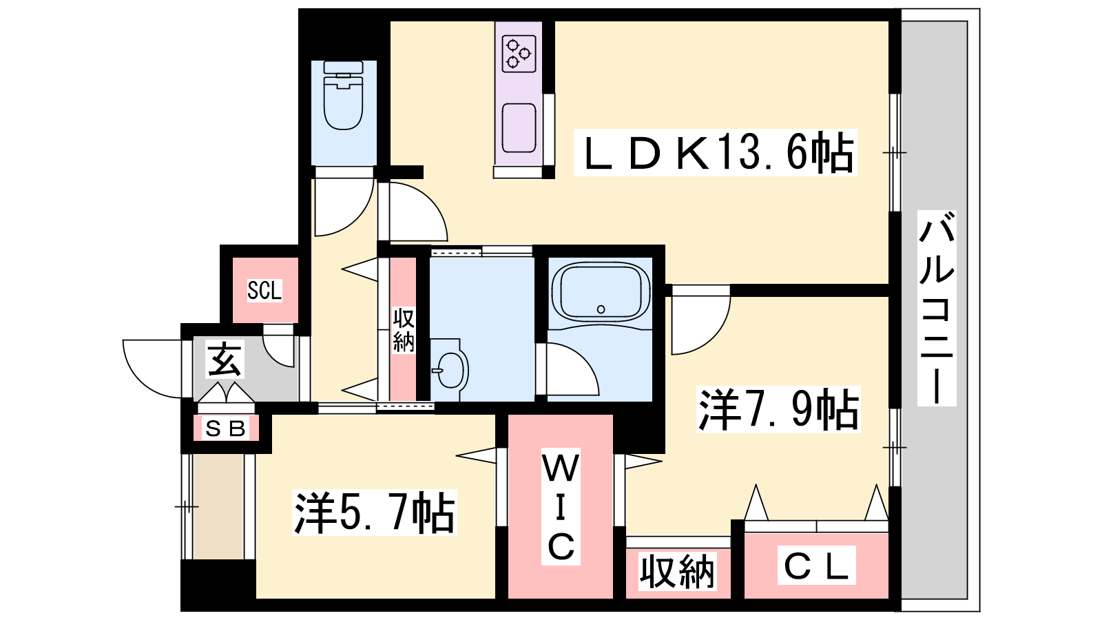 - LDK13.6帖、洋室7.9帖、洋室5.7帖