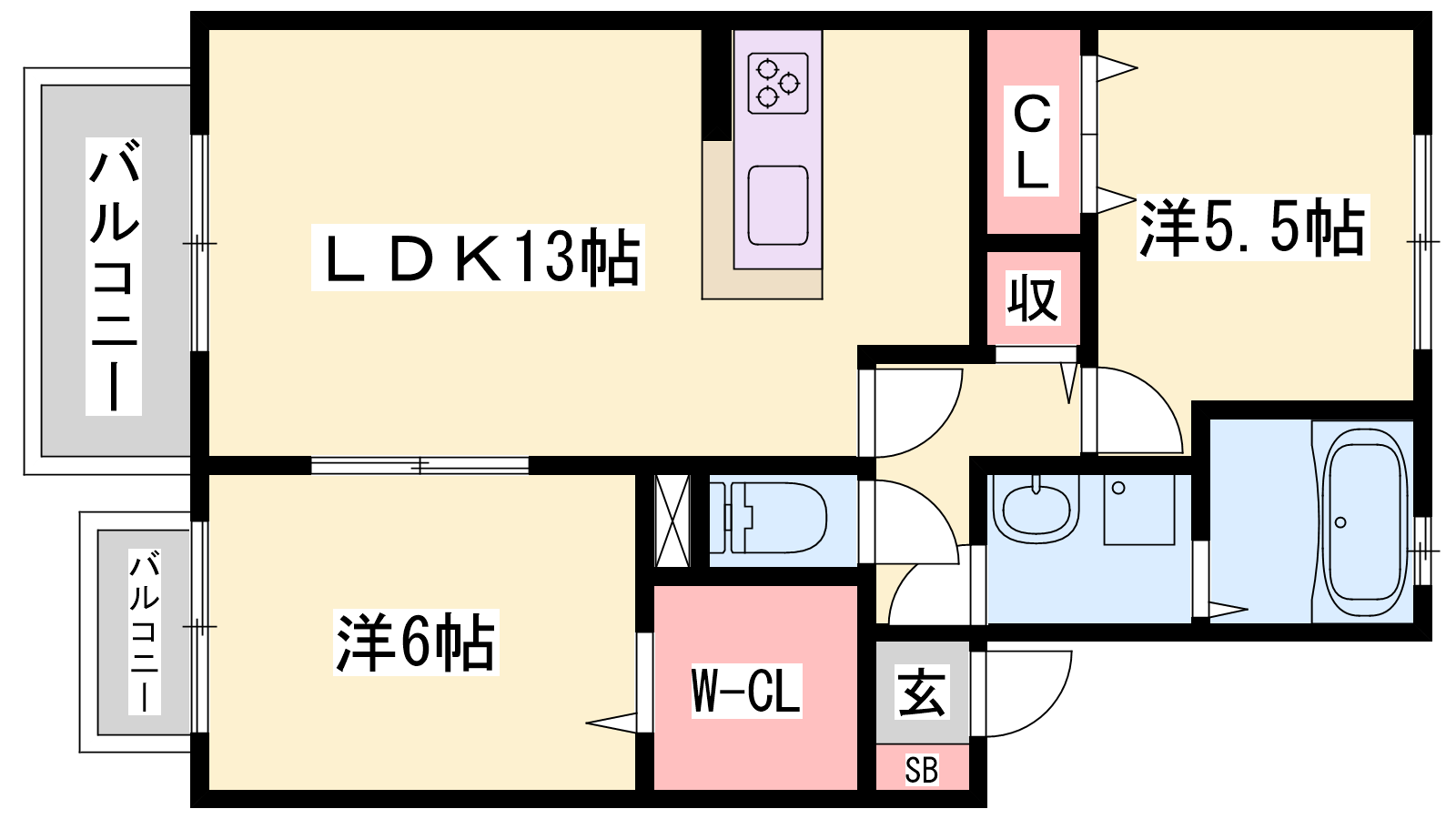 - LDK13帖、洋室6帖、洋室5.5帖