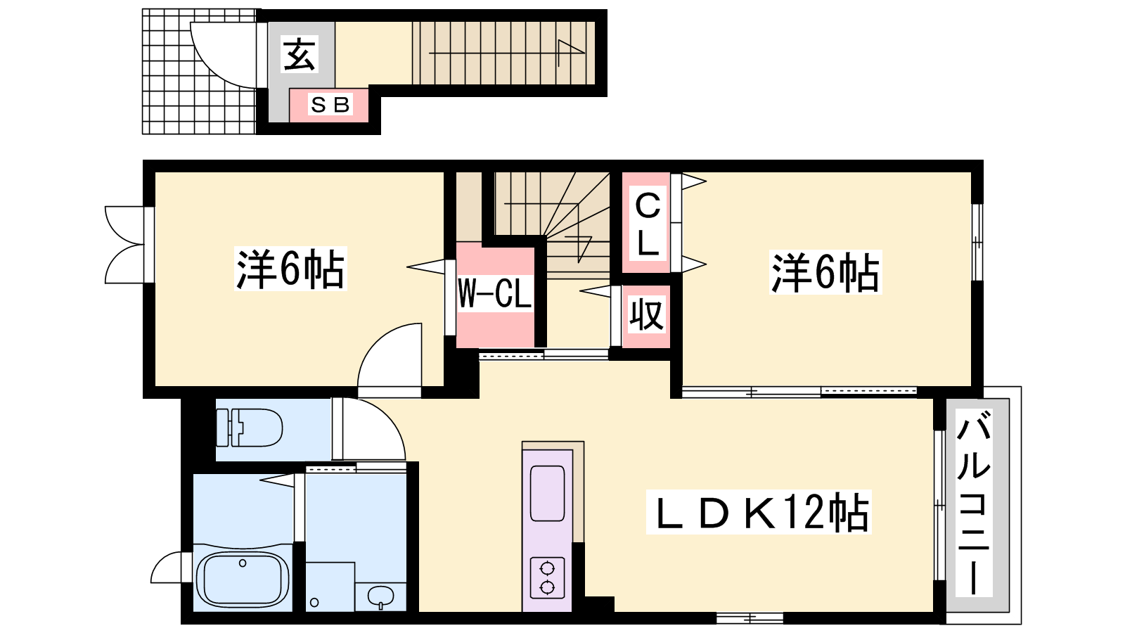 - LDK12帖、洋室6帖、洋室6帖