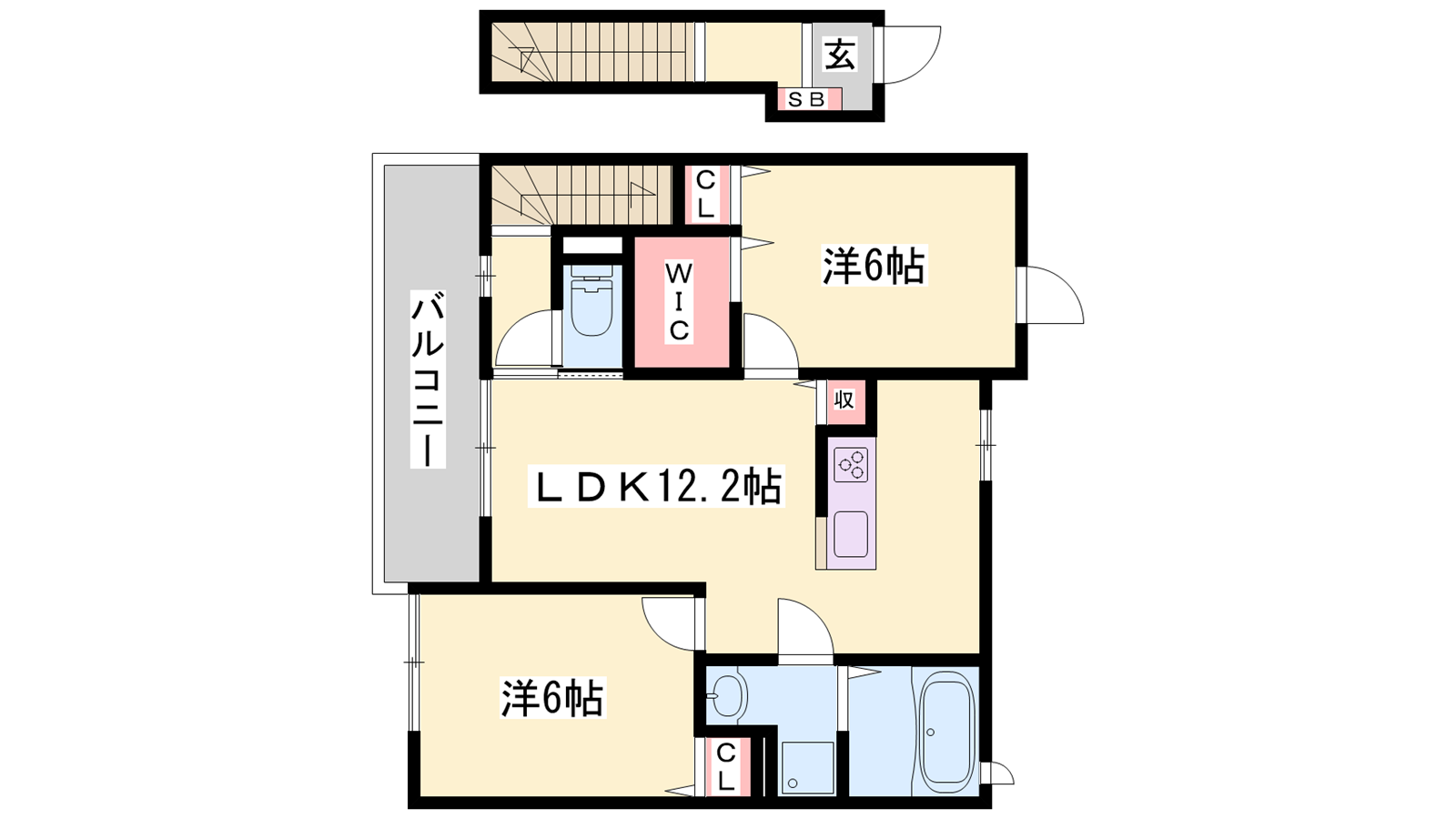 - LDK12.2帖、洋室6帖、洋室6帖