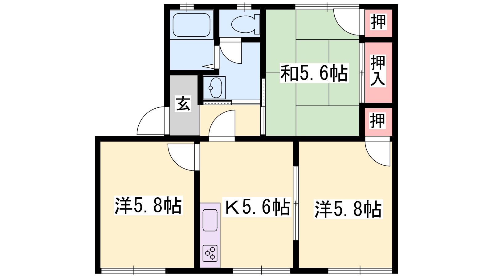 - K5.6帖、洋室5.8帖、洋室5.8帖、和室5.6帖