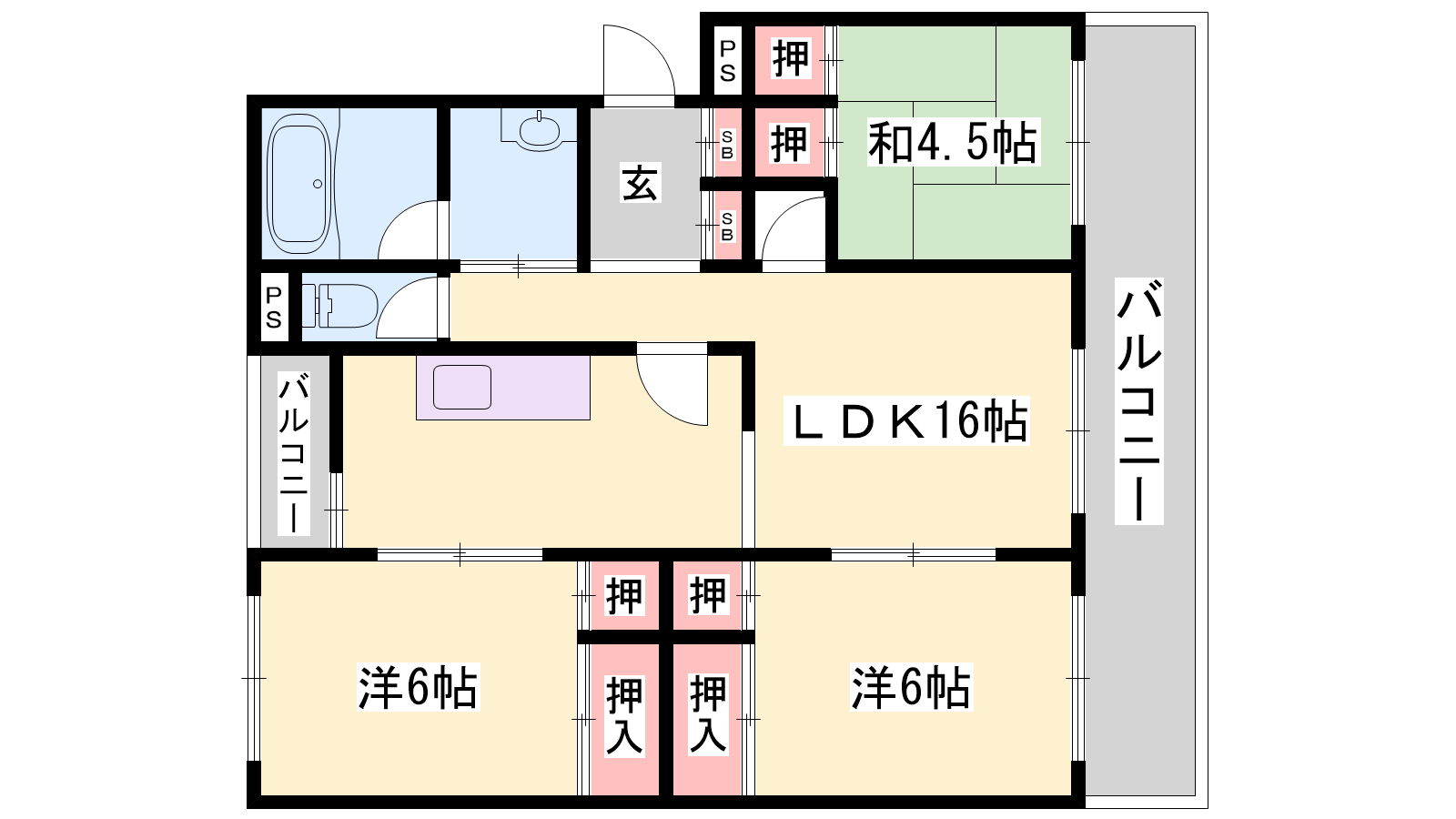 - LDK16帖、和室4.5帖、洋室6帖、洋室6帖