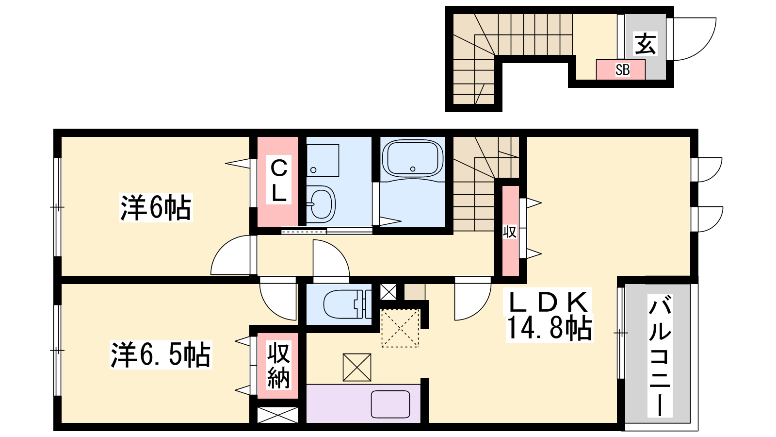 - LDK14.8帖、洋室6.5帖、洋室6帖