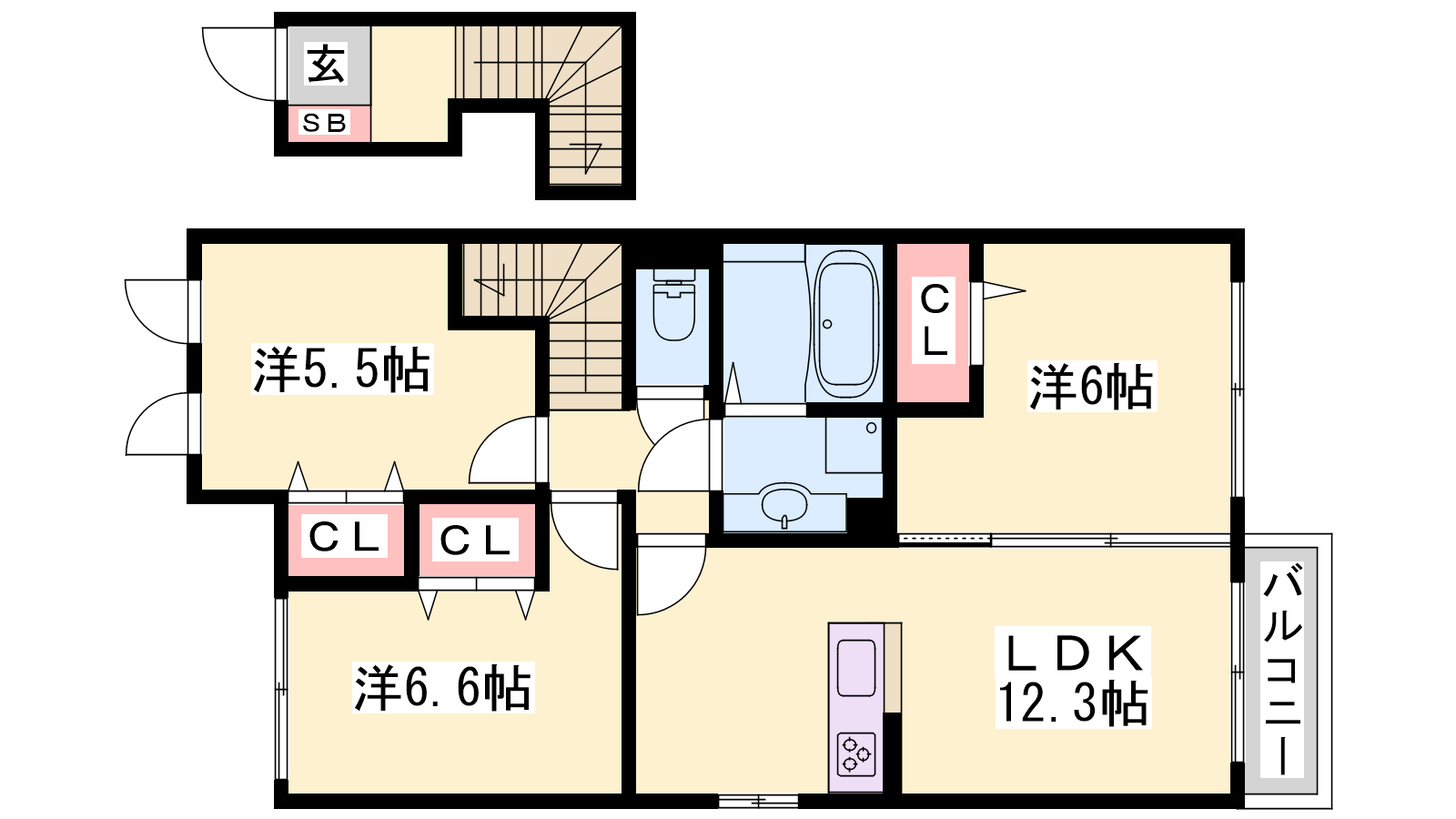 - LDK12.3帖、洋室6.6帖、洋室6帖、洋室5.5帖