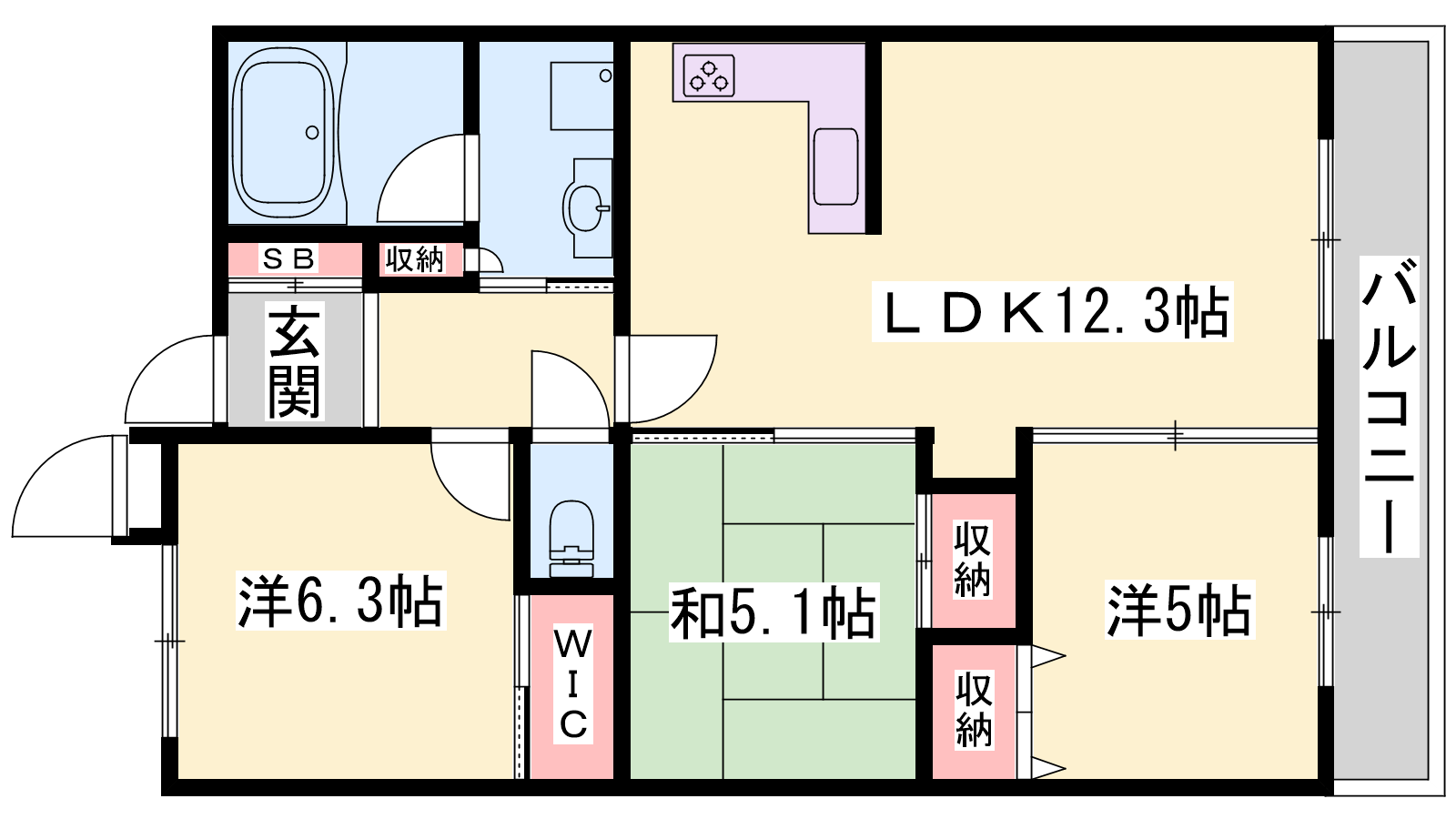 - LDK12.3帖、洋室6.3帖、洋室5帖、和室5.1帖