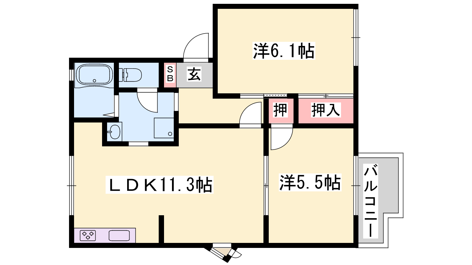 - LDK11.3帖、洋室5.5帖、洋室6.1帖