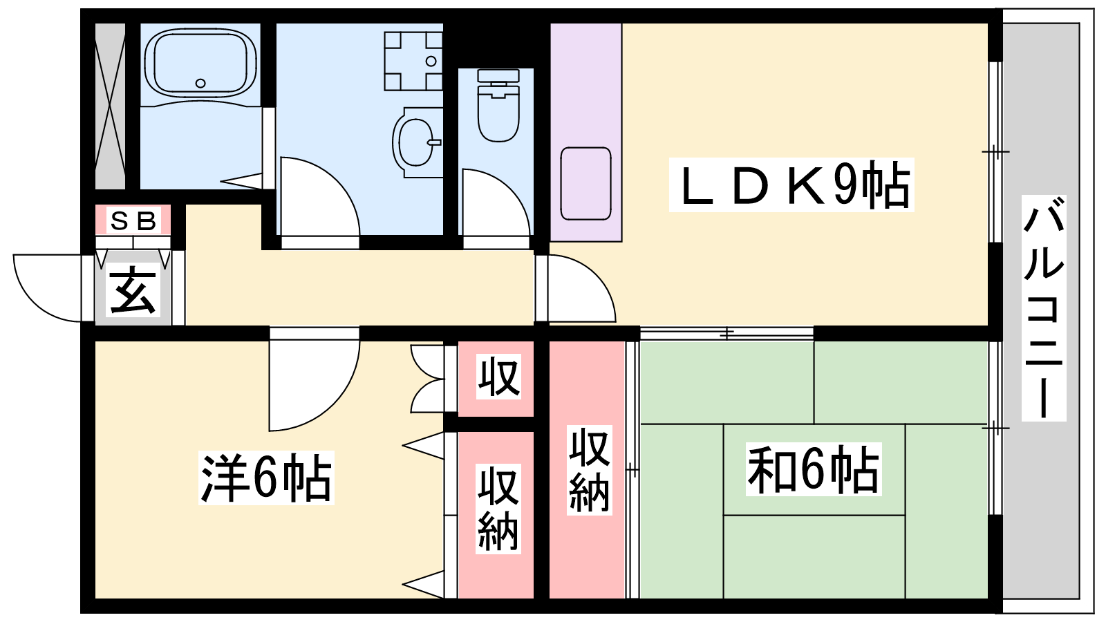 - LDK9帖、洋室6帖、和室6帖