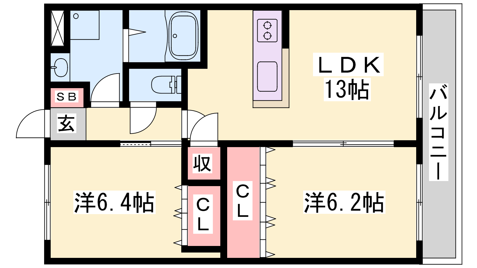 - LDK13帖、洋室6.4帖、洋室6.2帖