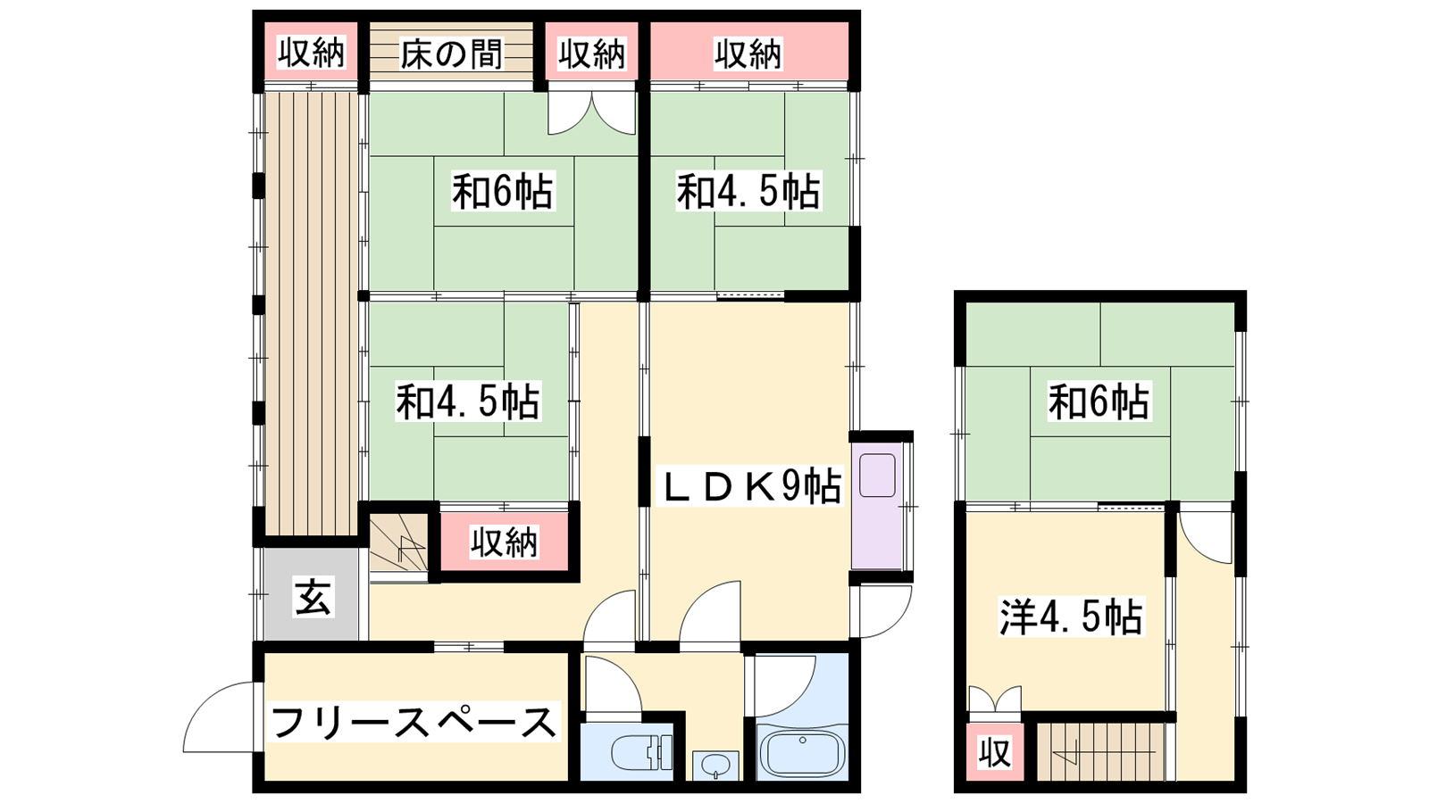 - LDK9帖、洋室4.5帖、和室6帖、和室6帖、洋室4.5帖、和室4.5帖
