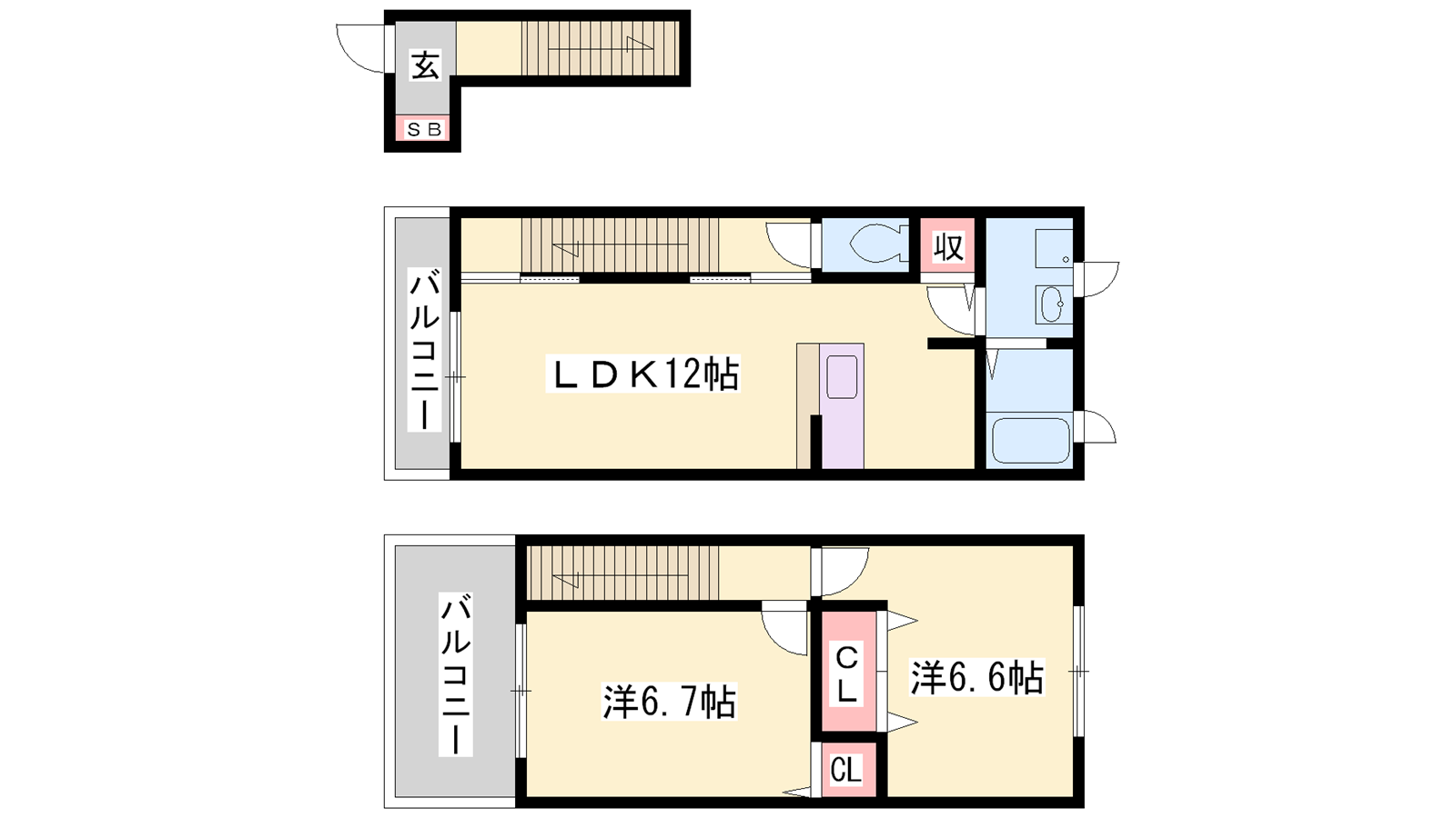 - LDK12帖、洋室6.7帖、洋室6.6帖