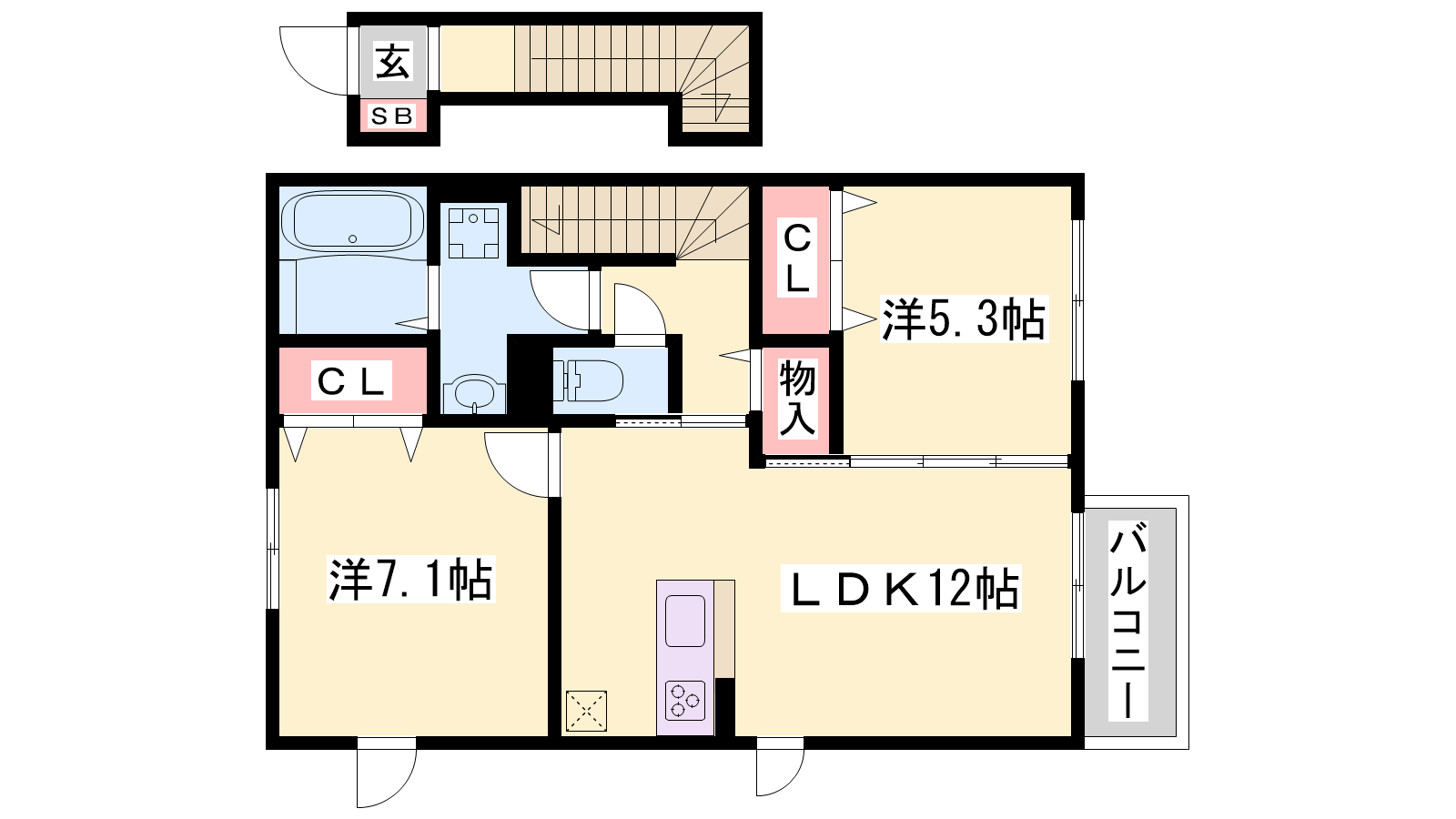 - LDK12帖、洋室7.1帖、洋室5.3帖