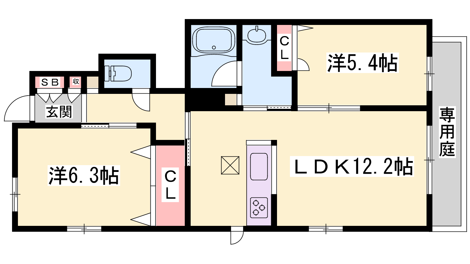 - LDK12.2帖、洋室6.3帖、洋室5.4帖