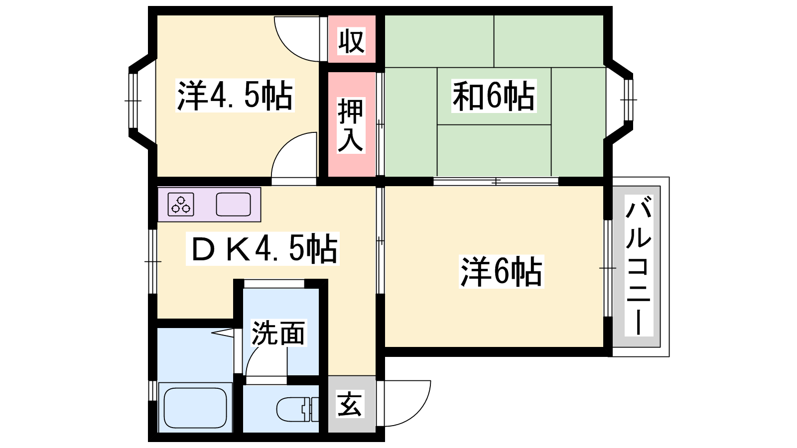 - DK4.5帖、洋室6帖、洋室4.5帖、和室6帖