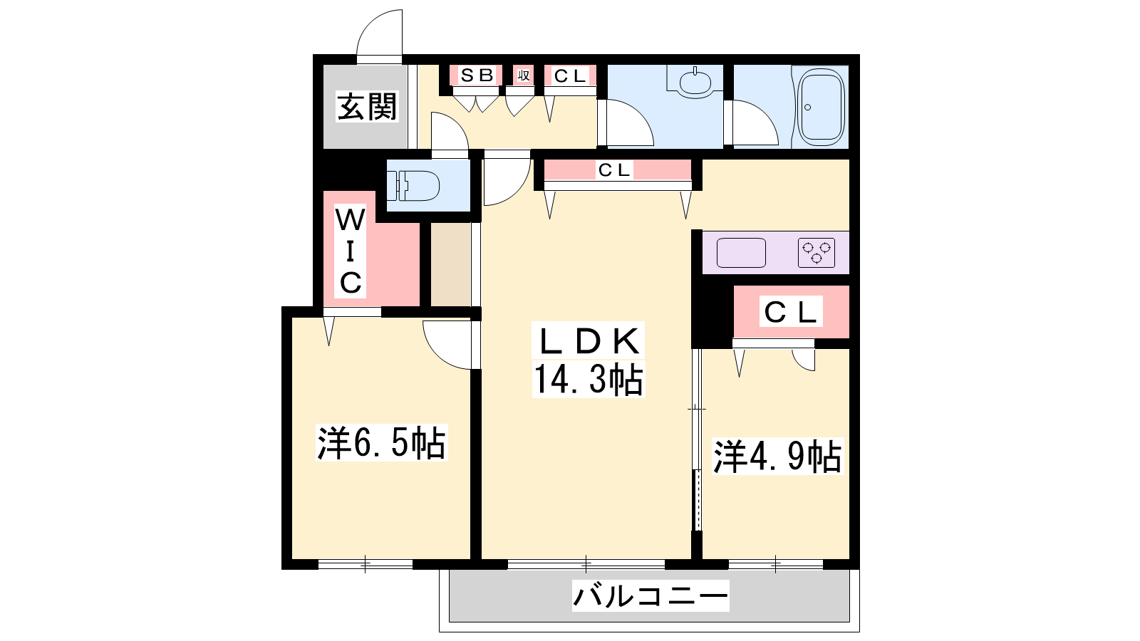 - LDK14.3帖、洋室6.5帖、洋室4.9帖