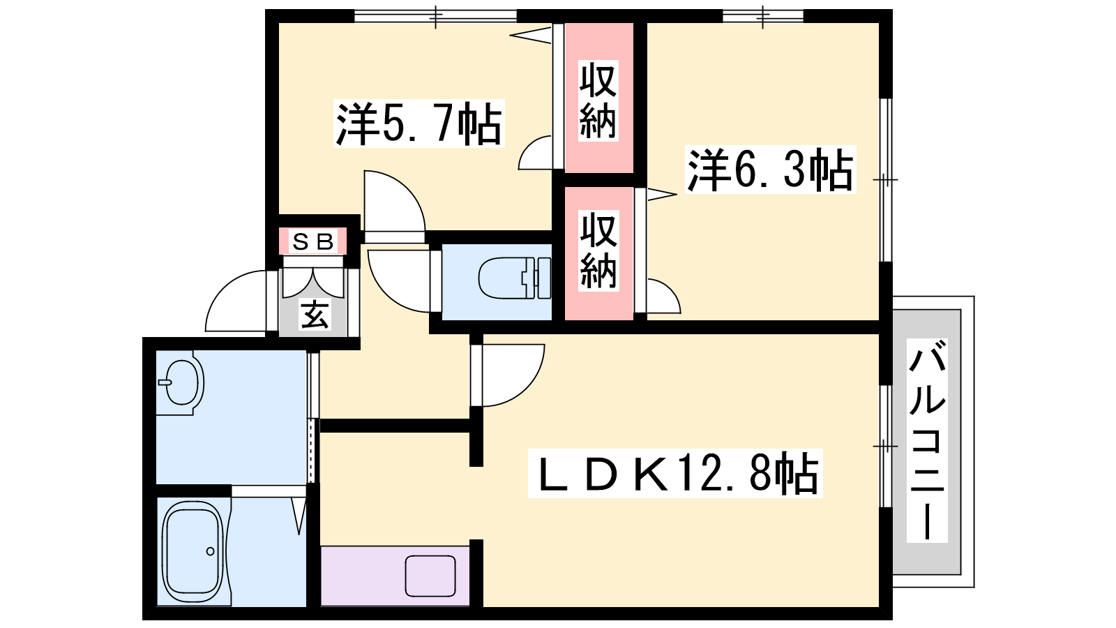 - LDK12.8帖、洋室6.3帖、洋室5.7帖