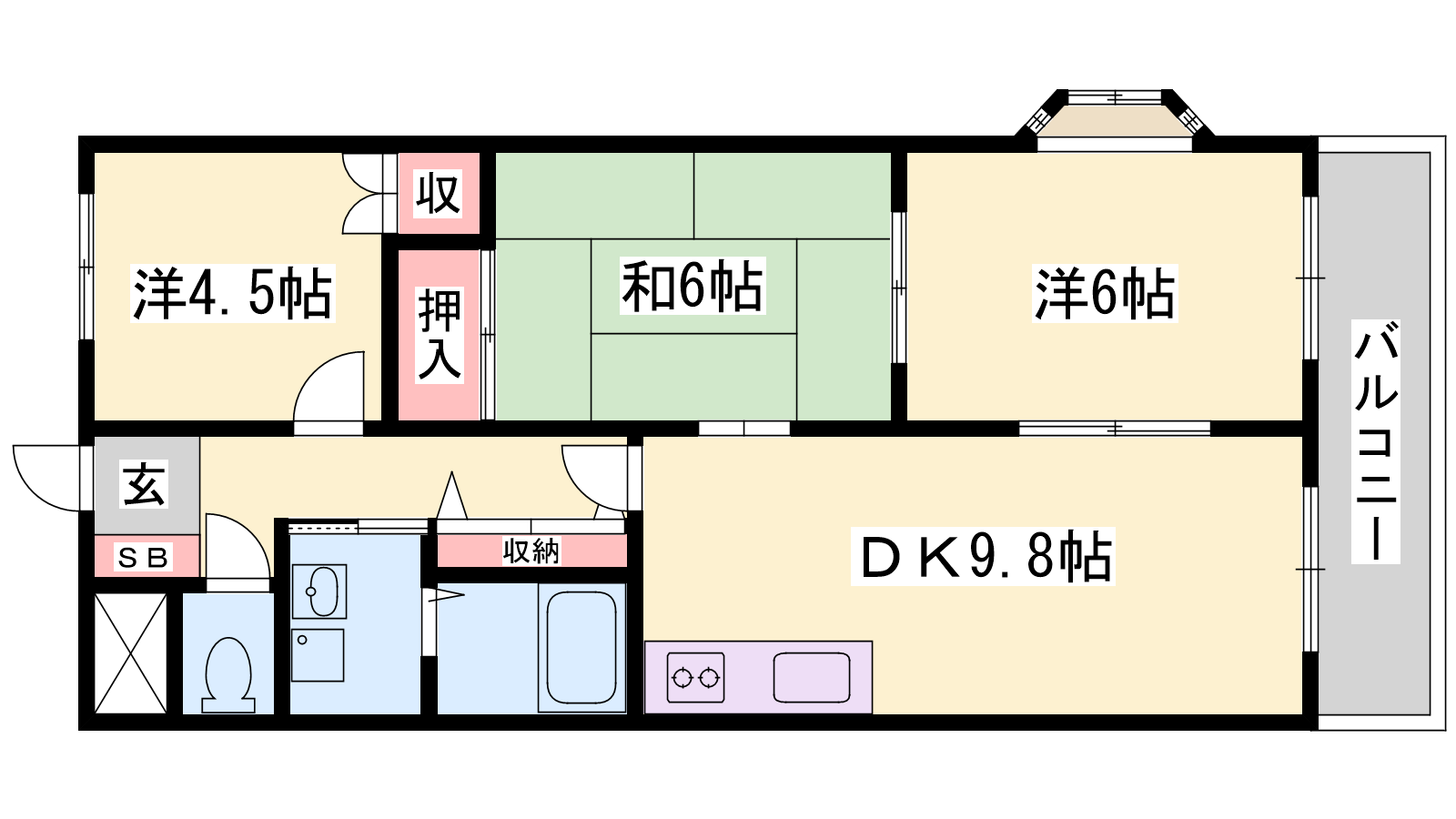 - DK9.8帖、洋室6帖、洋室4.5帖、和室6帖