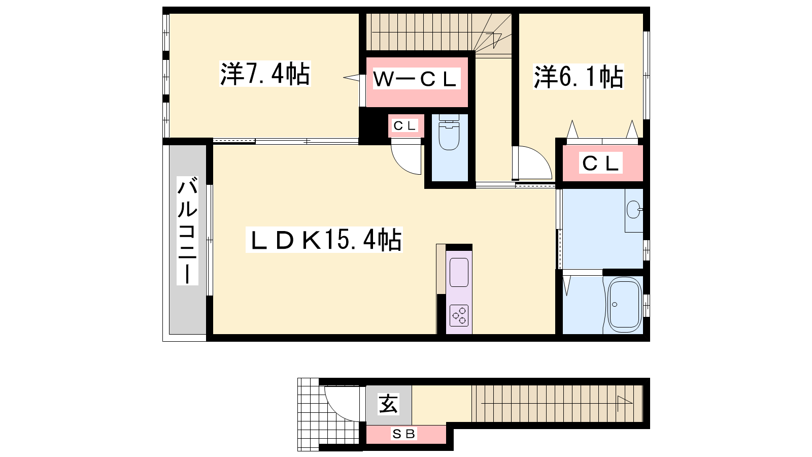 - LDK15.4帖、洋室7.4帖、洋室6.1帖