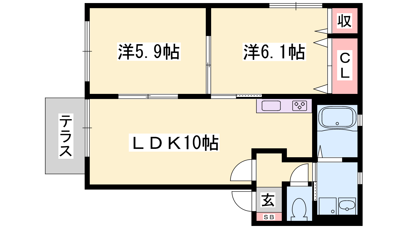 - LDK10帖、洋室6.1帖、洋室5.9帖