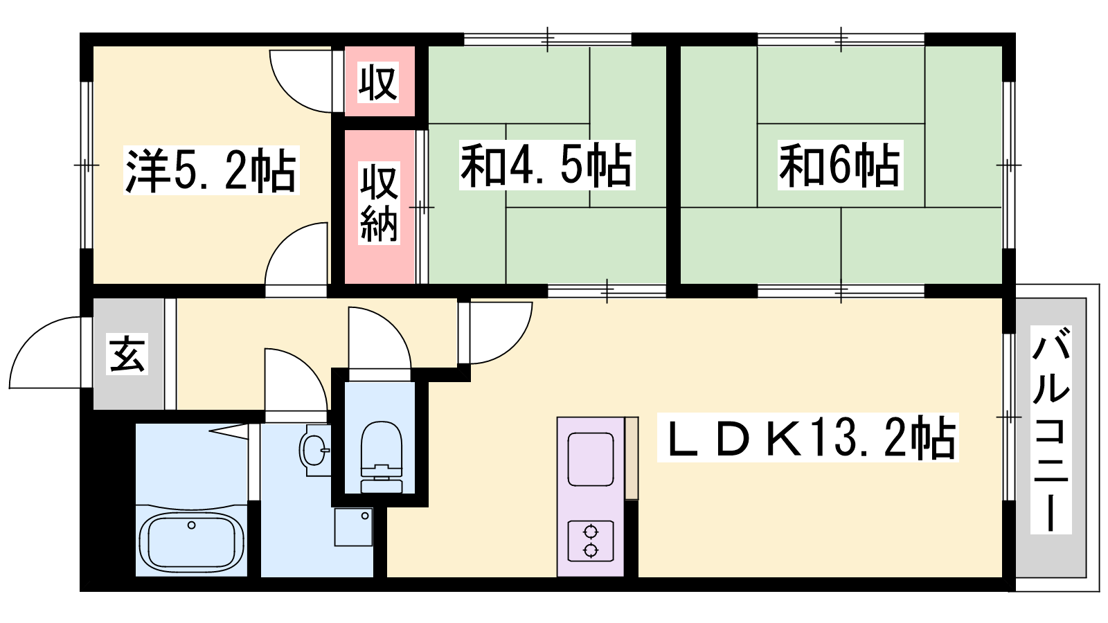 - LDK13.2帖、洋室5.2帖、和室6帖、和室4.5帖