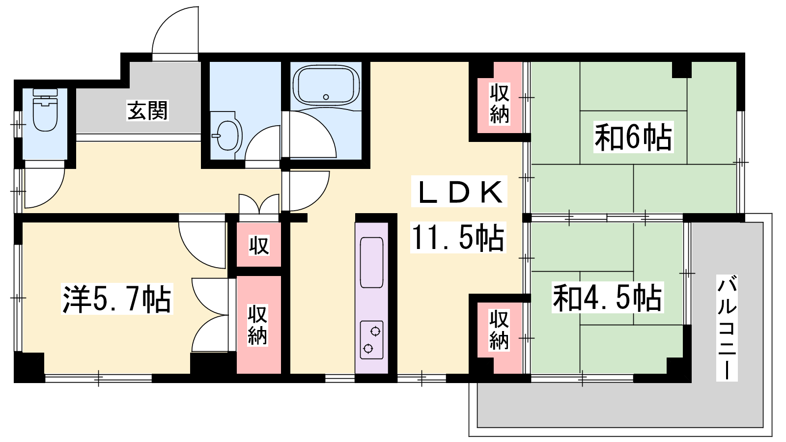- LDK11.5帖、洋室5.7帖、和室6帖、和室4.5帖