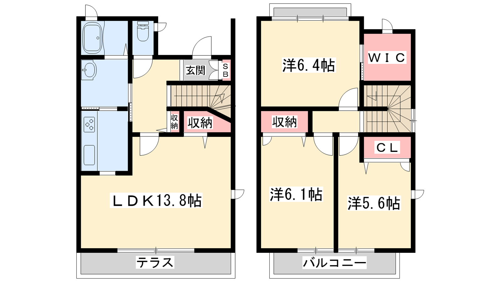 - LDK13.8帖、洋室6.4帖、洋室6.1帖、洋室5.6帖