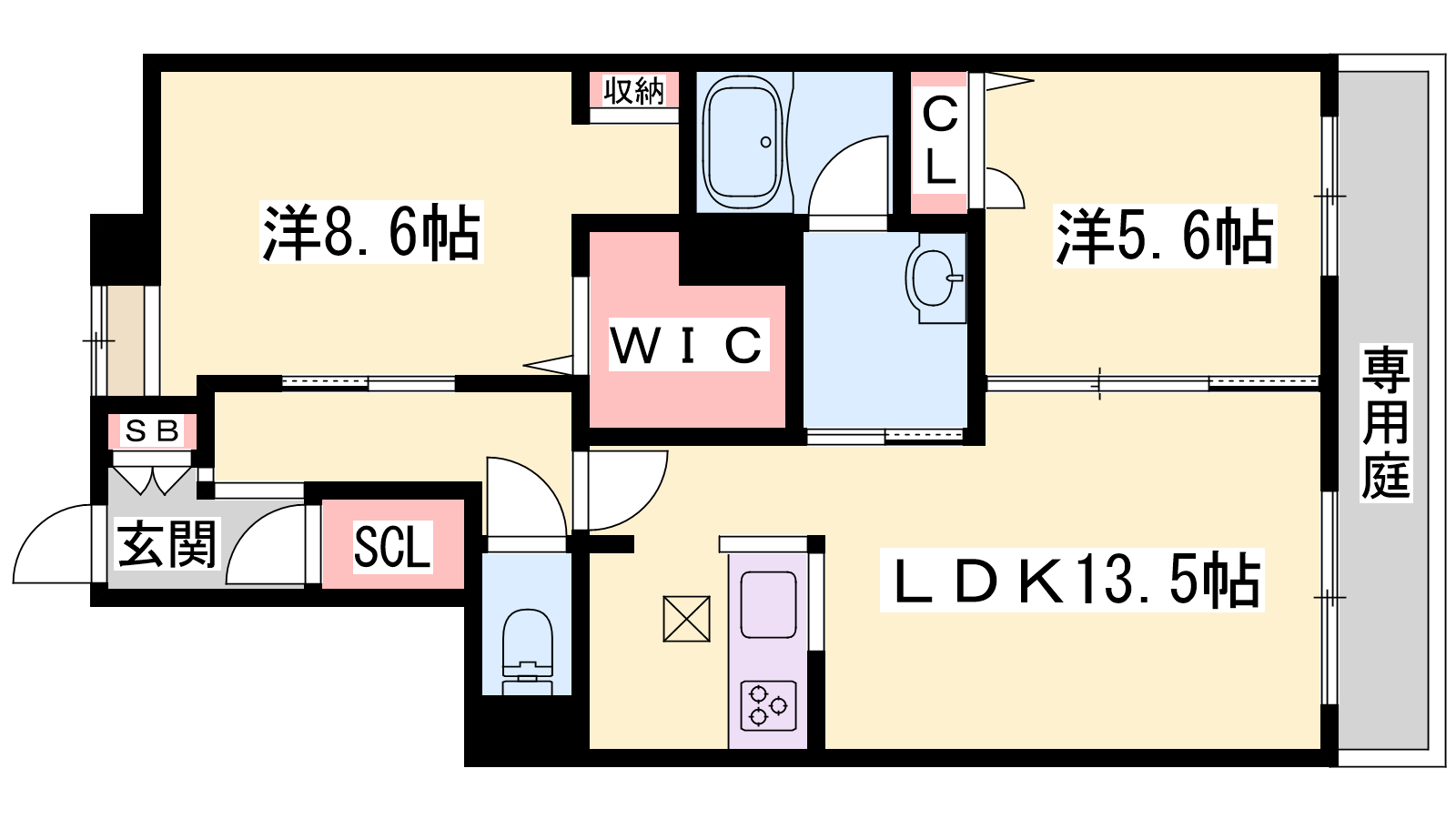 - LDK13.5帖、洋室8.6帖、洋室5.6帖