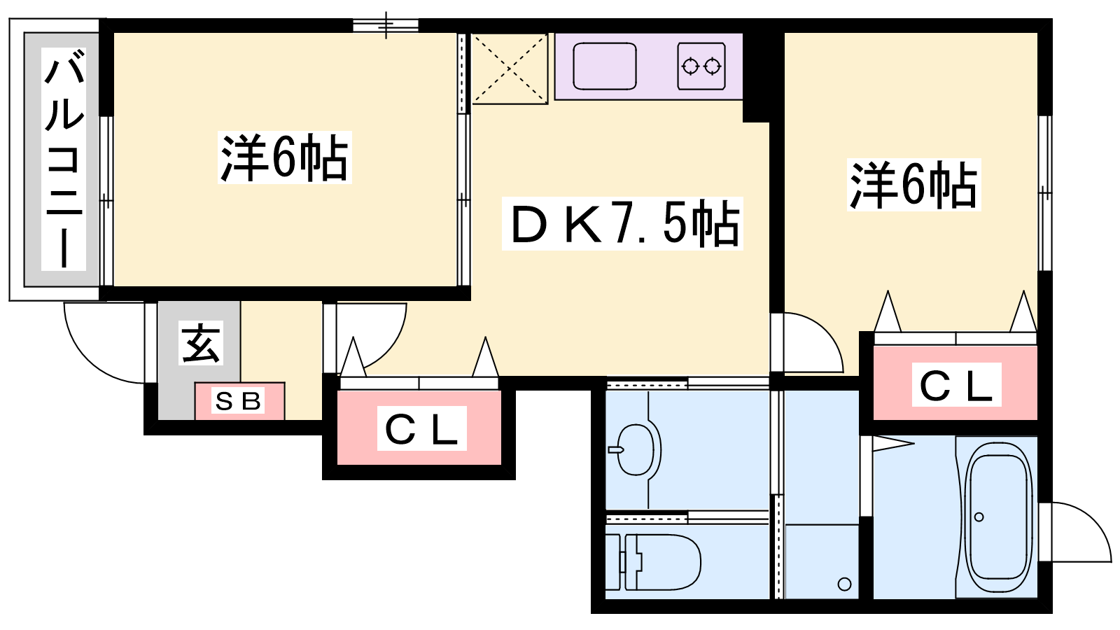 - DK7.5帖、洋室6帖、洋室6帖