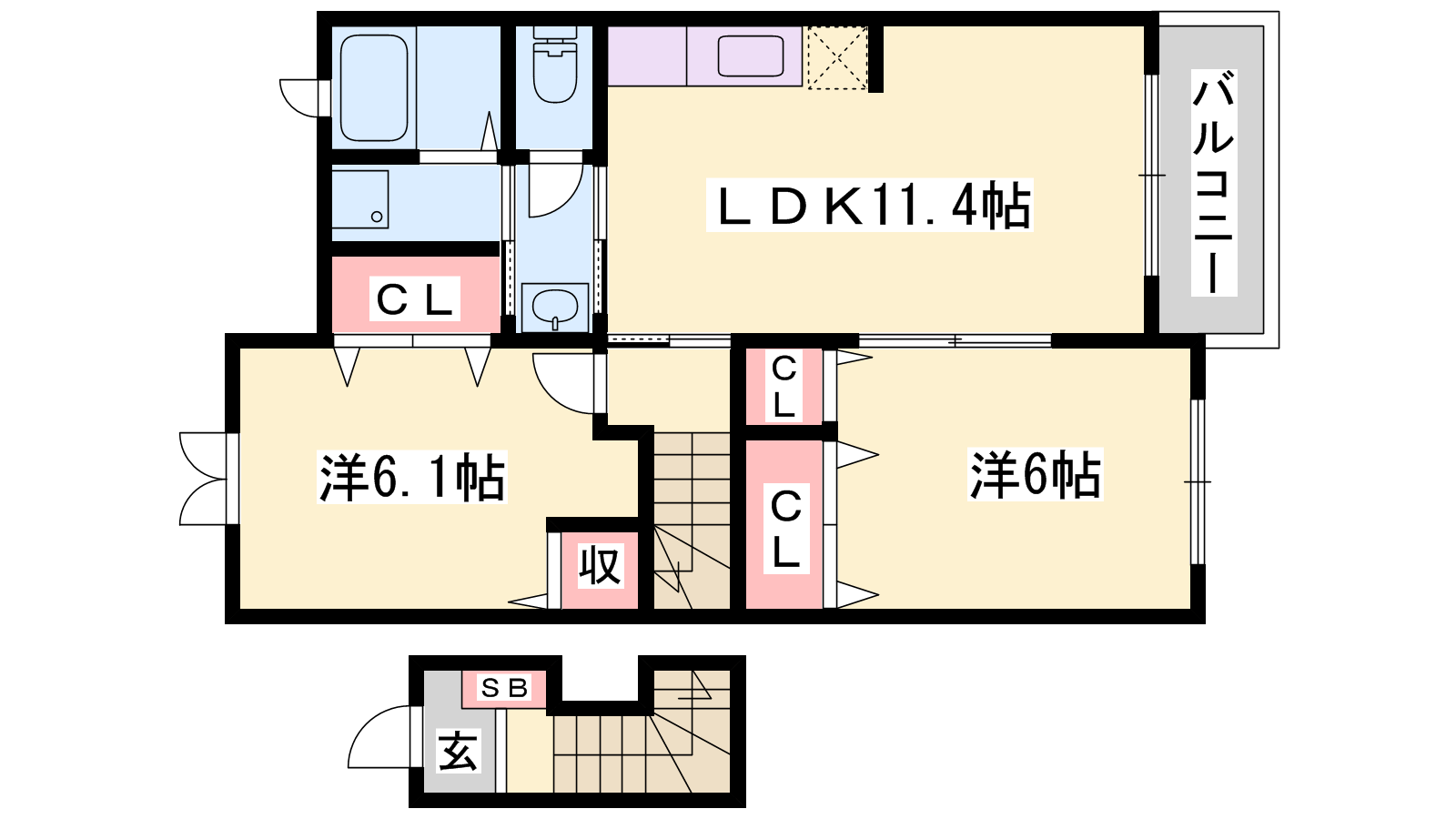 - LDK11.4帖、洋室6.1帖、洋室6帖