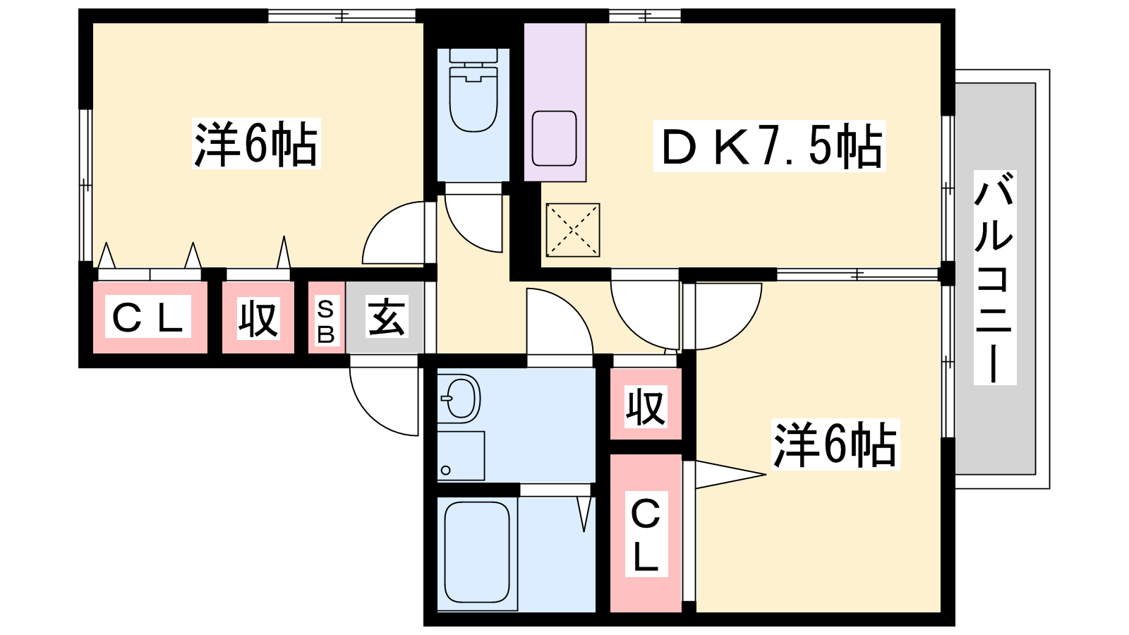 - DK7.5帖、洋室6帖、洋室6帖
