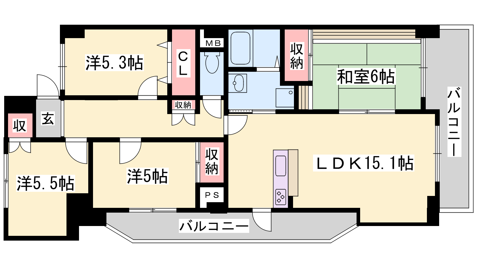 - LDK15.1帖、洋室5.5帖、洋室5.3帖、洋室5帖、和室6帖