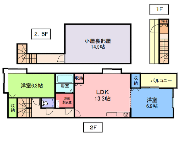 - LDK13.3帖、洋室6.9帖、洋室6.3帖、S14.9帖