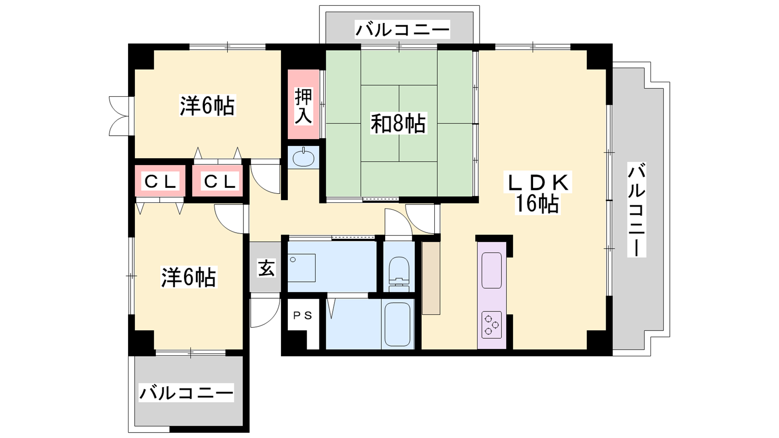 - LDK16帖、洋室6帖、洋室6帖、和室8帖