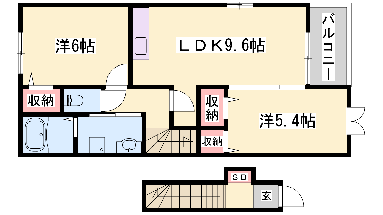 - LDK9.6帖、洋室6帖、洋室5.4帖