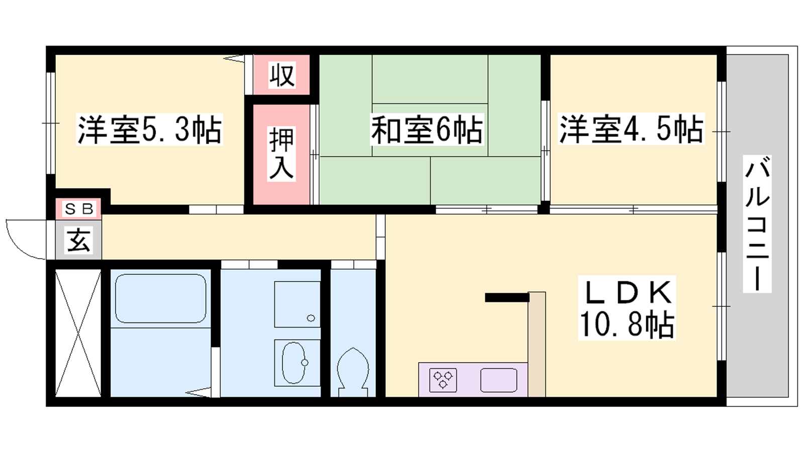 - LDK10.8帖、洋室5.3帖、洋室4.5帖、和室6帖